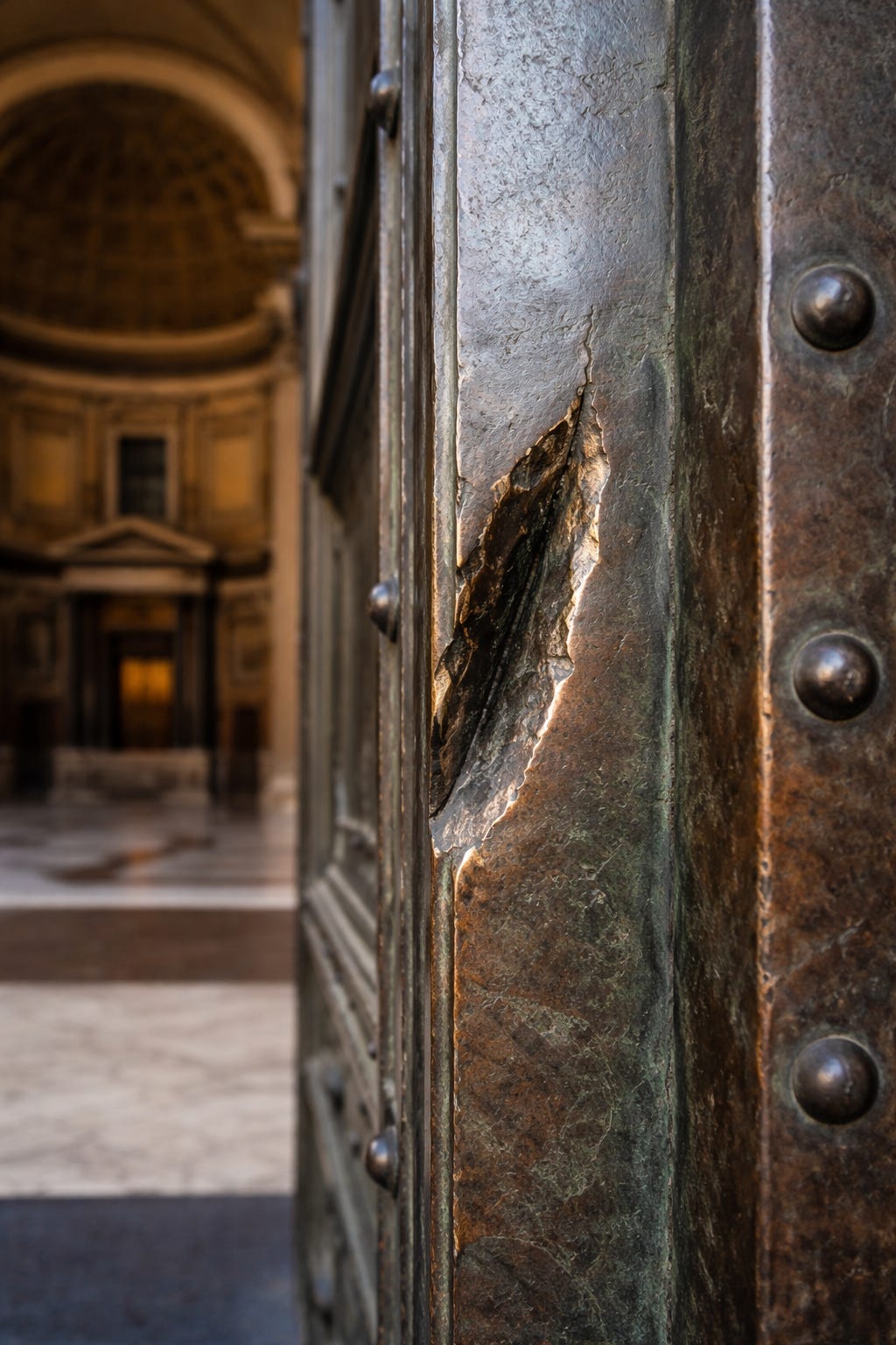 Nearly two millennia after the Pantheon was built under Hadrian in 125 AD, a failed attempt to steal its bronze still marks the doorway.